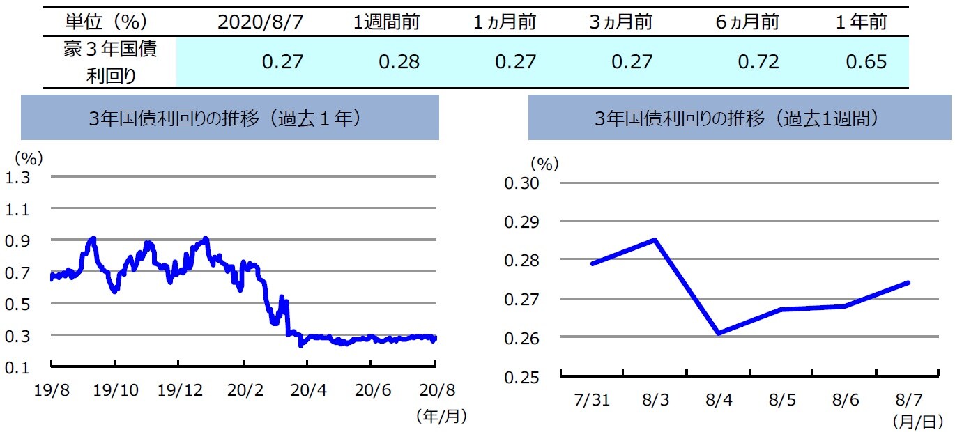 先週の豪州3年国債利回りは、低下しました。週前半に豪州準備銀行(RBA)が債券購入を再開すると決定したことを受け、利回りは低下しました。その後米国の追加経済対策に対する期待から利回りは上昇に転じましたが、週間を通してみると豪州3年国債利回りは低下(国債価格は上昇)しました。