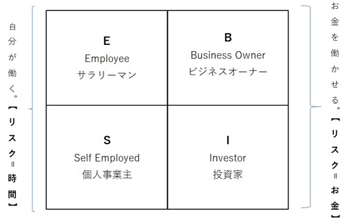 クワドラント図をご覧いただくとおわかりのように、E(サラリーマン)とS(個人事業主)は向かって左側に、B(ビジネスオーナー)とI(投資家)は向かって右側に配置されています。