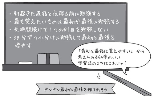 「記憶に残りやすいのは最初と最後」をうまく活用しよう。科目をこまめに切り替えたり、勉強するときの順番を入れ替えたりすると効果的。