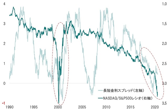 新型コロナ禍の下、世界的にIT・デジタル関連のアウトパフォームが続いている。米国では、NASDAQ/S&P500レシオがITバブル期に迫った。流動性の大量供給だけでなく、名目金利がゼロになったことで、バリュエーションの割高感に対する感応度が落ちたことも背景だろう。この相場の転換点は、長期金利の上昇によるイールドカーブの変化、即ち景況感の改善なのではないか。