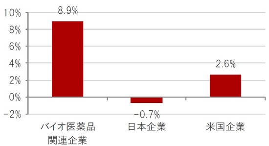 ※バイオ医薬品関連企業:ナスダック・バイオテック指数、日本企業:TOPIXの構成銘柄、米国企業:S&P500種株価指数