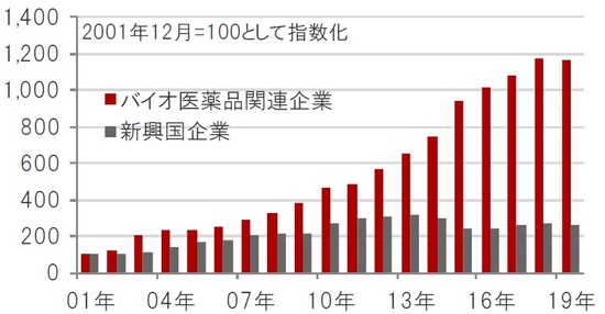 ※バイオ医薬品関連企業:ナスダック・バイオテック指数、新興国企業:MSCI新興国株価指数構成銘柄