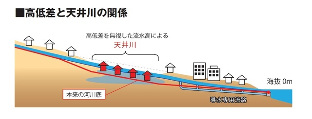 増幅する降雨量や自然環境に対応して総雨量の収容を拡大するために天井川にするのではなく、河川の高低差を見直し、河川底を掘り下げることが原理的解決方法である。