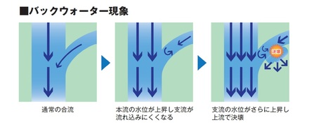 本流が上流で集積した水量を下流の支流に押し戻すことになる。本流に集積できない降雨の残量に本流から逆流水が入ってきて積算される。これは全て科学のメカニズムである。