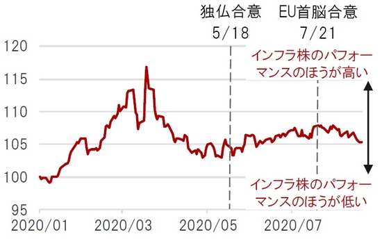 また、2021年から2022年の間に全体の70%を拠出することが義務付けられているため、比較的早期に「グリーン・ディール」が動き出すだろう。独仏合意があった5/18以降、MSCI欧州インフラ株指数はMSCI欧州株指数を上回る場面もあったが、本格的な物色はまだ始まっていない。この欧州復興基金という「歴史的偉業」によって、欧州株を見直す機運が高まりつつある。