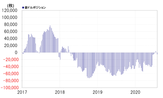 そんなユーロに対する以上に、この数ヵ月で大幅な米ドル安となったのが対豪ドルでした。ところが、少なくともCFTC統計の投機筋のポジションを見る限り、豪ドルは足元でも全く極端な買い越しとはなっていません(図表2参照)。