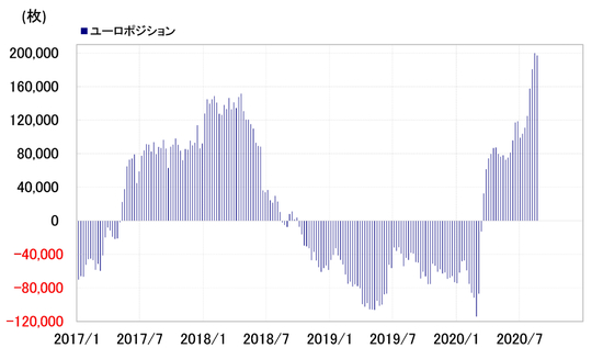 米ドル安トレンドが展開すると、基本的に米ドルを売り、米ドル以外の外貨を買うことになるわけですが、そのなかでもプロの投資家の代名詞のような存在、ヘッジファンドなどの取引を反映しているとされる、CFTC統計の投機筋のポジションを見ると、ユーロは対米ドルで過去最大の買い越しになっています(図表1参照)。