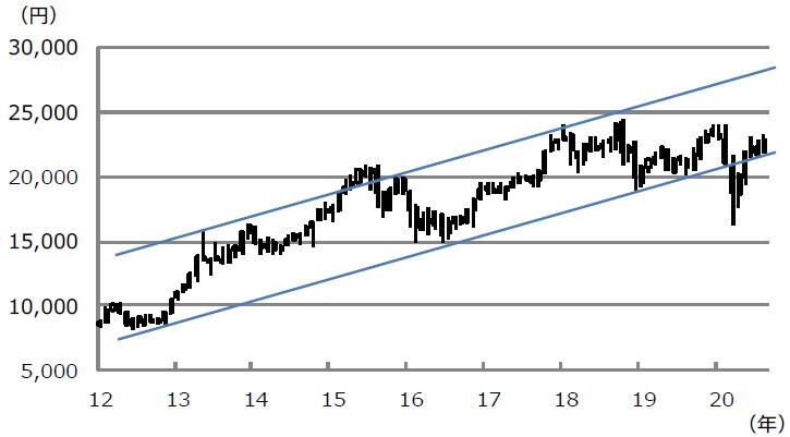日経平均株価は、2013年5月高値と2018年1月高値を結んだ上値抵抗線と、2012年10月安値と2016年6月安値を結んだ下値支持線によって、上昇トレンドが形成されています(図表2)。今年3月の大幅な株安で、いったん下値支持線を割り込みましたが、その後は再びトレンド内に回帰し、現在も下値支持線付近で推移しています。この点から、日経平均株価のトレンド自体は、まだ上向きと解釈できます。