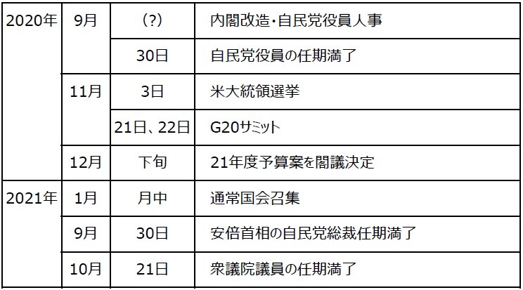 そのため、仮に安倍首相が辞任となれば、新総裁の政策方針が明らかになるまで、日本株は海外勢を中心とする売りに押され、いったん調整色を強める恐れがあります。ただ、新型コロナウイルスの感染が収束していない限り、誰が新総裁になっても、景気に配慮した政策は当面継続される可能性は高く、政局不安による株安が発生しても、一時的なものになるとみています。