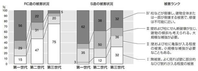 グラフからもわかるように、第3世代のRC造の建物は、75%が「無傷」、20%が「小規模な補強が必要なこともある」程度の被害となっています。
