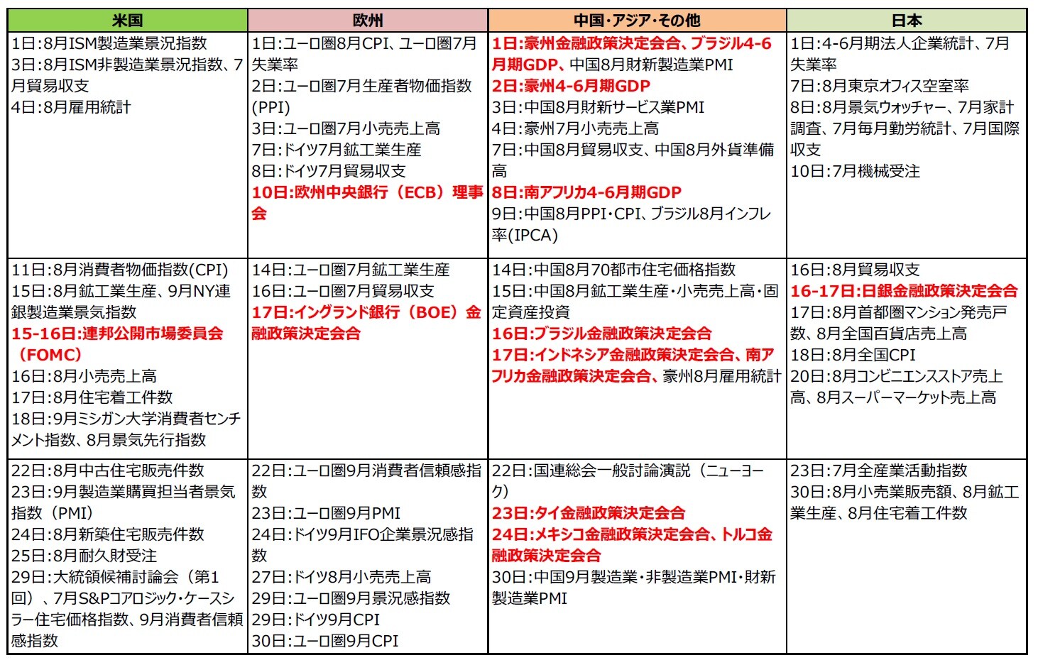 ■9月の米連邦公開市場委員会(FOMC)では金融緩和の強化が注目されます。フォワードガイダンスの強化と資産大量買入などの追加緩和が実施されるとの見方があります。また、29日には大統領候補の第1回討論会が行われます。全3回開催される公開討論会は選挙に大きな影響を及ぼすとされており、接戦が予想されるトランプ、バイデン両候補の発言が注目されます。