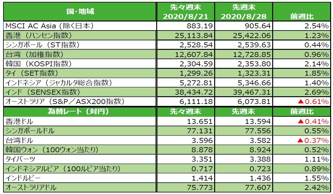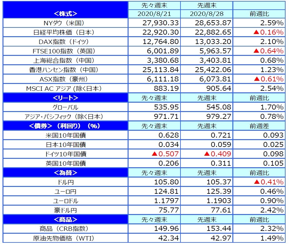 (注4)前週比は2020年8月21日から2020年8月28日まで、前月末比は2020年7月31日から2020年8月28日まで、前年末比は2019年末から2020年8月28日まで。