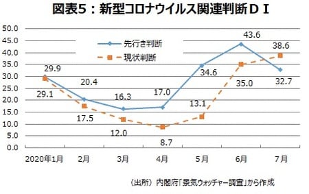 新型コロナウイルスに関するコメントをした景気ウォッチャーの回答だけを使い、新型コロナウイルス関連・現状判断DIと、先行き判断DIを独自に作成する(図表5)と、新型コロナウイルス関連・現状判断DIは4月には8.7と3月の12.0から1ケタに下落したが、5月13.1、6月35.0、7月38.6に戻した。一方、新型コロナウイルス関連・先行き判断DIは、いち早く底打ち感が出ていた。3月の16.3を底に6月は43.6へ上昇していたが、感染者の増加から先行き懸念が台頭し、7月は32.7に低下してしまった。