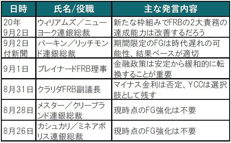 一方、主に長短金利の水準を操作すると理解されているYCCは、同じくクラリダ副議長のコメントにもあるように、現段階での導入の可能性は低いとしても、将来の導入は否定しないという声が多いようです。政策金利を低水準に据え置いても、長期金利が当局の想定以上に上昇した場合などのための選択肢の一つと考えているのかもしれません。ただ、すでに実施している無制限の国債購入はある意味事実上YCCとも言えなくはなく、バランスのとり方など課題もありそうです。