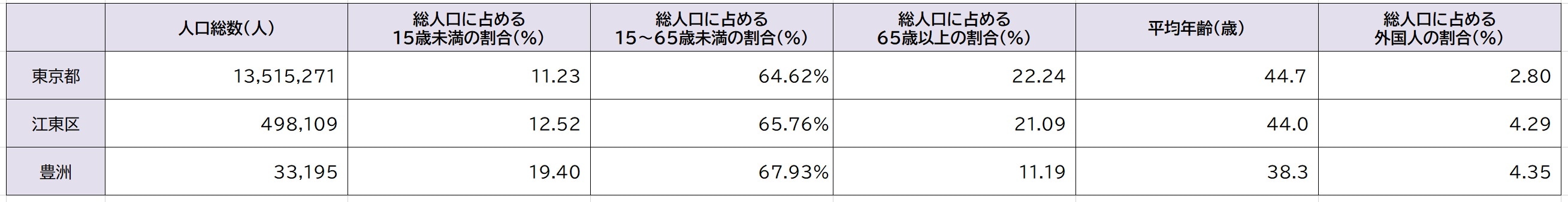 豊洲のある江東区の人口は50万人弱。豊洲には、そのうち15%が住んでいます。昨今のタワーマンションブームによって、ファミリー層の流入が続いたこともあり、15歳未満の割合が20%弱と東京都平均を8ポイント近くを上回り、平均年齢も東京都平均よりも6歳近く若いという、若年層が多く住む街です(図表1)。