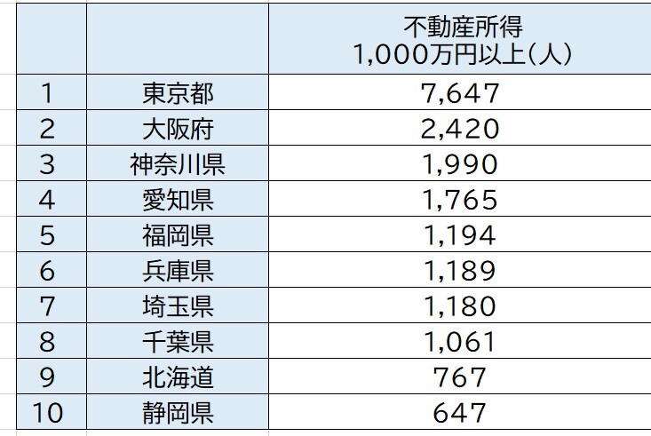 そんな憧れの人は、どこにいるのでしょうか。国税庁が公表している「統計年報」から、所得税納税者を対象に不動産所得で1,000万円以上と申告している人を、都道府県別にみてみましょう。