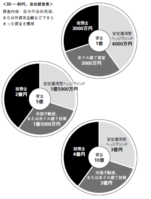 自分の会社をM&Aで売却、あるいは投資で一気に超富裕層になった人のポートフォリオです。手にした金額によって許容できるリスクも異なってくるために、金額別のポートフォリオを作成しました。