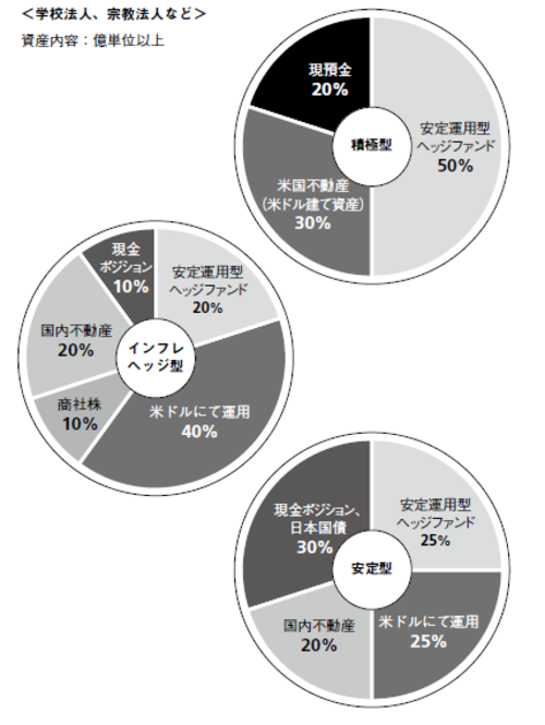 事例集の最後は、学校法人や宗教法人など、ヘッジファンドをよく使う「法人」のケース。積極型、インフレヘッジ型、安定型のポートフォリオを設定してみました。基本は、ヘッジファンドでもひとつのファンドに偏らずに、複数のファンドに分散投資を図ること。現金ポジションは、現金が必要なときはすぐに銀行などから融資してもらえる環境にあるため、日本国債などで運用するのもひとつの方法です。