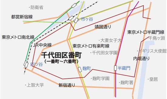 千代田区一番町から六番町の総称である千代田区番町。日本で初めての高級住宅地と言われています。皇居の西側に位置し、南に新宿通り、北に靖国通り、東に内堀通り、西は「四ツ谷」駅に至るまでの区域。駅としては「半蔵門」「麹町」「市ヶ谷」「四ツ谷」が利用できるエリアです。