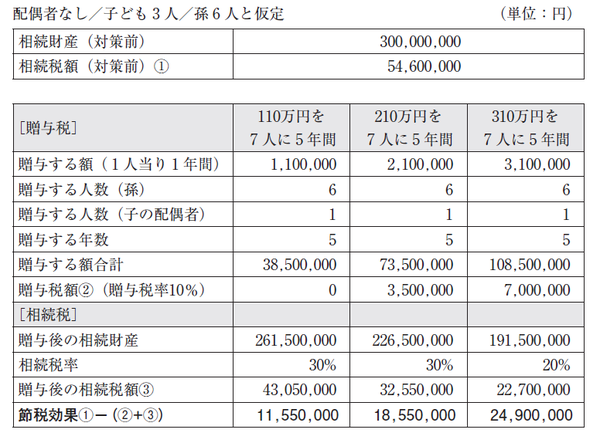 【図表1 孫6人と長男の妻に5年間生前贈与した場合の相続税額の節税効果】