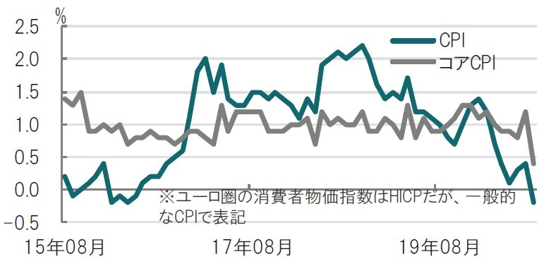 次に、下落傾向を強めたユーロ圏の物価動向も課題です。先のレーン理事の講演に話を戻すと、コロナ感染拡大で3つの困難、不安定な市場、軟調な貸出、そしてインフレ率の低下に直面したと述べています。ただ、市場の安定は元に戻りつつあり、また、貸出は長期資金供給プログラム(TELTRO)が下支えとなり、企業向けを中心に回復を実感している様子です。しかしユーロ圏の物価は残された課題です。指標をみると、8月の総合の消費者物価指数は前年同月比マイナス0.4%となっています(図表2参照)。