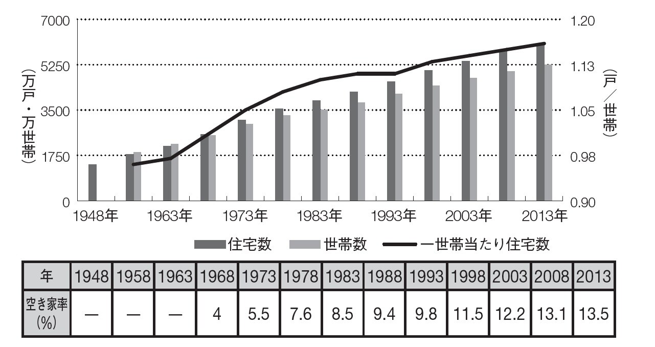 その後、バブル崩壊以降の地価下落などの問題がありますが、その間も新設住宅の着工は続き、今度は空き家の問題が深刻化してきたのです。
