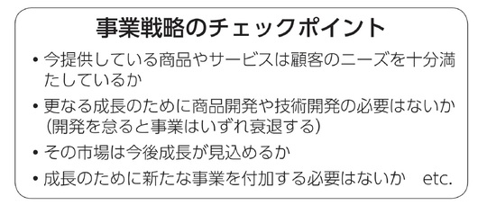 事業を取り巻く環境が時々刻々と変わっていくときに、事業の内容も環境の変化についていくべく変化を遂げる必要があります。現在提供している商品やサービス、そしてそのマーケットをチェックすることが大事です。
