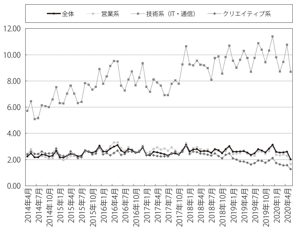 まず、組織内部で求められている人材の職種の変化を見てみよう。下記の図表3は、転職エージェントのパーソルが提供している「職種別の転職求人倍率」である。