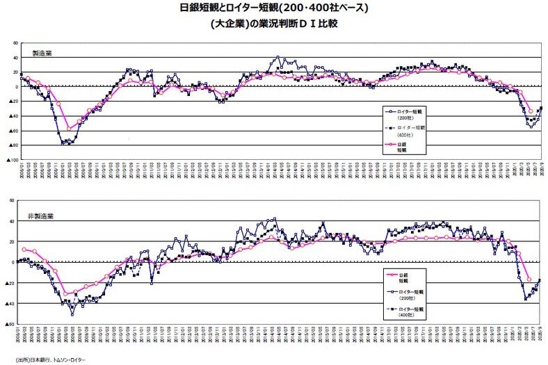 ●9月14日に発表されたロイター短観9月調査の調査期間は8月31日から9月9日である。9月調査400社ベースの製造業の業況判断DIは6月調査の▲46から17ポイント改善し▲29になった。一方、200社ベースの製造業の業況判断DIは6月調査の▲55から25ポイント改善し▲30となった。