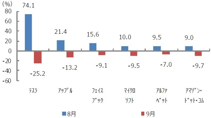 米国株式市場では、8月に大きく上昇したハイテク銘柄が、9月に入り調整色を強めています。世界最大の電気自動車(EV)メーカーであるテスラの株価は、8月に74.1%上昇しましたが、9月は11日までの8営業日で25.2%下落しました。また、アップルの株価も、8月に21.4%上昇しましたが、9月の同期間で13.2%下落しました。その他、主なハイテク銘柄も同様の動きが確認されます(図表1)。