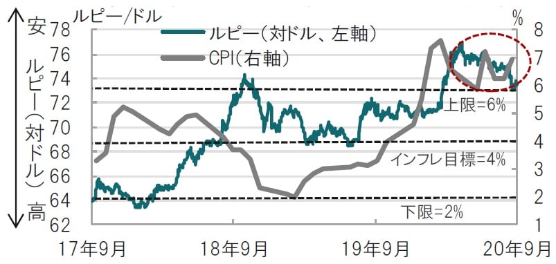別のトレードオフが、インドの成長率改善を遅らせた可能性もあります。インフレ率の高止まりから、インド中銀が金融緩和に消極的だったことです。例えば、8月の金融政策決定会合では市場は景気の悪さから幅広く利下げを予想していましたが、インド中銀は据え置きました。インフレ目標上限を上回る水準で利下げを手控えたと見られます。また新興国ではインフレ率上昇が消費を抑制する傾向もあるだけに、まずは物価の落ち着きを確認する戦略と思われます。