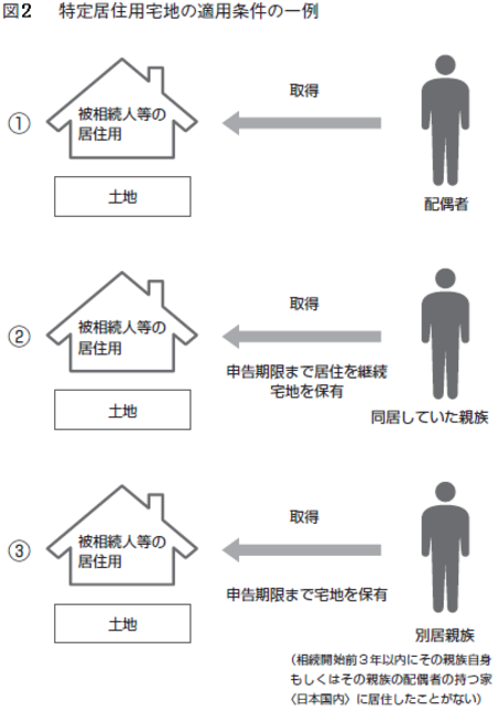 そういった状況に対応し、生活を送る上で最低限必要な財産を守るためにできた制度なのです。この小規模宅地等の特例の適用条件を満たす居住用宅地や事業用宅地のことを、「特定居住用宅地」または「特定事業用宅地」といいます。特定居住用宅地の適用条件に関しては、(図2)を見てください。