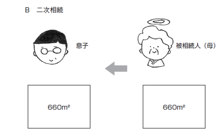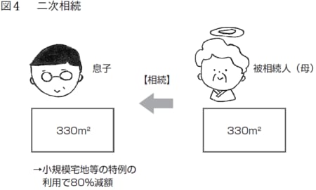 例えば、660㎡ある自宅の土地を相続するケースを考えてみましょう。(図3)の一次相続をご覧ください。実子である息子と母親で二分し、息子の相続した330㎡の土地に小規模宅地等の特例を適用します。その後、母親が亡くなった際に、母親の所有している330㎡の自宅の土地を息子が相続(二次相続)し、再び小規模宅地等の特例を適用(図4)したとします。