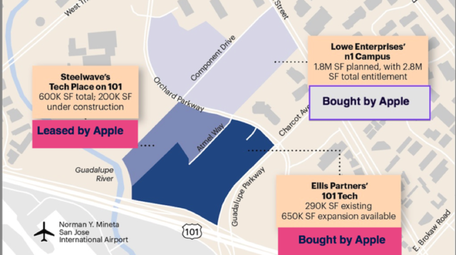 2016年1月、サンノゼ市がアップルに対して、今後15年にわたって延べ415万SF(=37万4000平米、土地面積86エーカー[=34万8000平米])のR&Dおよび事務所スペースの開発許可を承認しました。そのうち61エーカー[=24万7000平米]は3億400万米ドルで、昨年買収したもの。