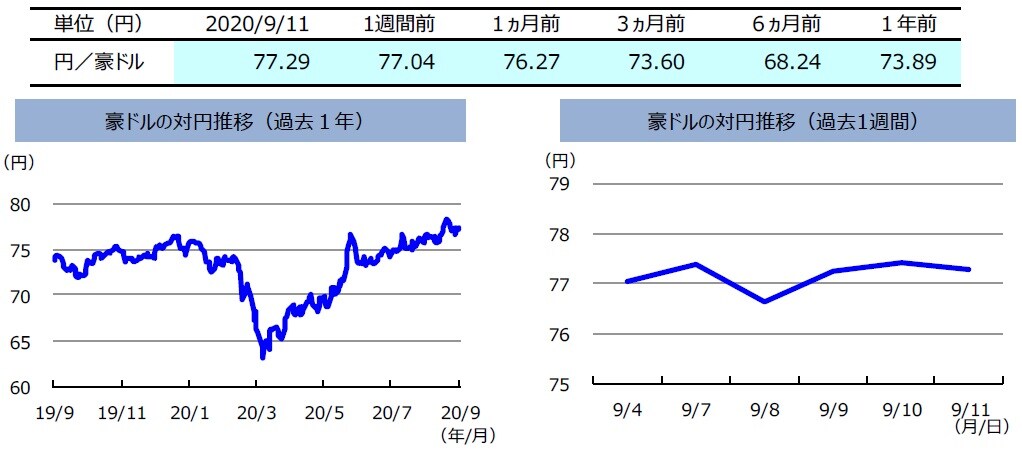 先週の豪ドルの対円レートは、若干上昇しました。豪州の新型コロナ感染再拡大は減少傾向にあるものの、米中対立に対する懸念などを受けて豪ドルの対円レートは上値の重い展開となりました。週後半は、米株式市場の反発などを受けたリスク選好の動きが豪ドルを買い支え、週間で見ると豪ドルの対円レートは若干上昇しました。