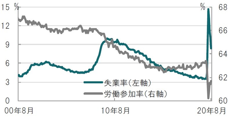 もしそうであるなら、フォワードガイダンスで雇用の最大化を明示したことは、景気回復を目指す段階では雇用の回復も含めた政策運営が想定されます。ただ、その運営には課題も残されていると見ています。インフレ率は個人消費支出(PCE)価格指数で2%と目標が数字で示されていますが、雇用最大化はそうではありません。一般には(低い)失業率で雇用の健全さが測定されます(図表1参照)。
