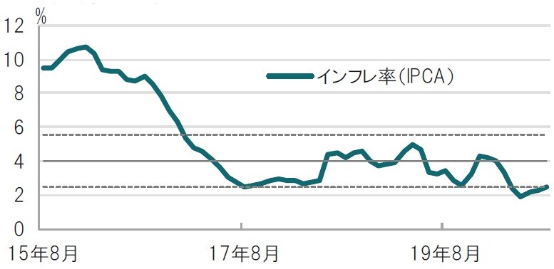 そこで、ブラジルのインフレ率を見ると、8月の拡大消費者物価指数(IPCA)は前年同月比で2.44%とインフレ率目標の下限(2.5%)近辺で推移しています(図表2参照)。ただ、この指数は月の後半にも公表され、9月23日公表予定の指数は前年同月比約2.6%が見込まれています。緩やかながら、恐らく過去のレアル安を反映して徐々に上昇している印象です。
