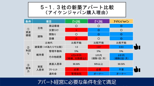 投資用のアパートであってもそれなりに資産価値がなければダメで、将来の売却を見据えると、資産性が高いに越したことはなく、投資としての利回りも必要です。これまでに学んだそれらの点を振り返り、マトリックスを組んで採点してみたところ、①資産価値、②利回り、③競争力のすべてにおいてアイケンジャパンがX社、Y社を上回ったので、購入に踏み切ったのだといいます。