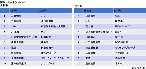 そこでこの表を見返してみると、なるほど学生は30年前も現在も、見事に大企業への就職を希望していることがわかります。業種こそ時代を反映して、以前は金融系、今では食品、ゲーム系などが人気ですが、商社や航空、電機、保険などは30年間ずっと鉄板の地位を誇ります。