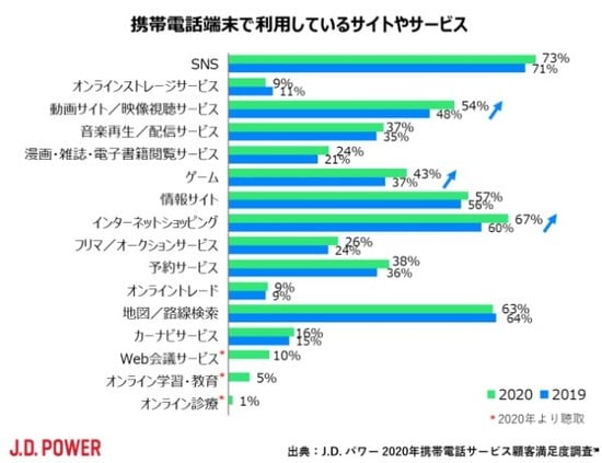 本年調査では、携帯電話(スマートフォン)端末で利用しているサイトやサービスについて、「動画サイト/映像視聴サービス」や「ゲーム」、「インターネットショッピング」を挙げるユーザーが昨年と比較して5pt以上増加した(図表1参照)。コロナ禍の中、エンタメ利用や日用品購入といった様々なシーンで、オンラインサービスの活用が増加したことが当調査からもうかがえる。