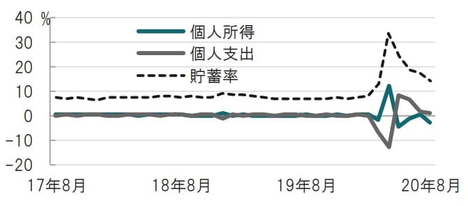 次に、個人消費支出と所得を見ると、所得は週600ドルの失業保険上乗せ給付が7月末に失効したことを反映しています(一部はトランプ大統領令で延長)。一方、支出は先月を小幅下回るも、前月比1.0%増とプラスを確保しています。支出を支えたのは貯蓄(の減少)です。貯蓄率を前月の17.7%から8月は14.1%に低下させ支出を維持した格好です。現在の貯蓄率の推定値は持ち合わせていませんが、コロナ前の水準に近づいていることが想定され、財政支援による所得の上乗せ分が枯渇しつつあるようです。追加財政の実施が待たれます。