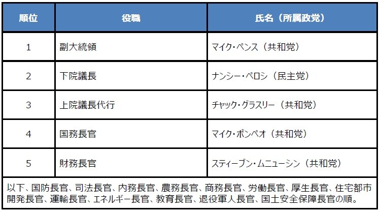 トランプ氏は10月3日、ツイッターにビデオメッセージを投稿し、体調はよくなっており、今後数日間が正念場になるとの考えを示しました。トランプ氏は入院先から執務にあたっていますが、仮に執務不能となった場合は、ペンス副大統領に権限が一時的に委譲されることになります。また、ペンス氏も執務不能となった場合は、ペロシ下院議長が大統領代行となり、以下、図表1の順番で権限が継承されます。