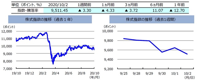 先週の豪州株式は、下落しました。米国の追加経済対策に対する期待はありましたが、豪州では豪州準備銀行(RBA)による追加的な金融緩和が先延ばしになるとの見方が出たことから豪州株式は軟調な展開となりました。米大統領候補討論会でバイデン副大統領が優勢と見られたことや、トランプ米大統領が新型コロナに感染したことなどの悪材料も加わり、週間では豪州株式は下落しました。