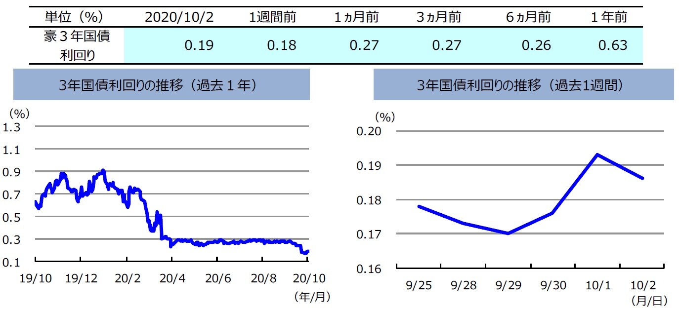 先週の豪州3年国債利回りは、上昇しました。米国における経済対策協議に関する前向きな報道を受け、主要各国の国債利回りは概ね上昇しました。豪州では豪州準備銀行(RBA)による追加的な金融緩和が1ヵ月先延ばしになるとの見方もあり、豪州3年国債利回りも上昇(国債価格は下落)しました。