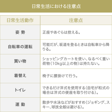 退院後の日常生活では、なるべく膝に負担がかからないように過ごしてください。具体的に気をつけていただきたい点を表にまとめます。