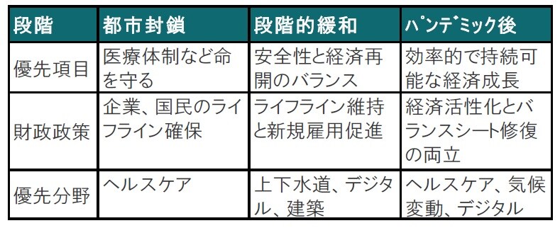 IMFが公共投資に前向きといっても、無節操に財政拡大を容認しているわけではありません。戦略が重要で、このイメージを図表1に示しました。新型コロナのパンデミックによる都市封鎖、段階的な緩和、そしてパンデミック後の3局面に分け、優先する戦略や優先して投資する分野をシフトすべきとしています。たとえばパンデミック時には医療体制や資金繰り支援が優先されるのは我々が経験してきたことです。