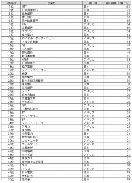 ここで、図表1と図表2の世界の時価総額ランキングを見ていただきたい。ジャパン・アズ・ナンバーワンの時代であった1989年の世界時価総額ランキングでは上位50社のうち、32社が日本企業であり、アメリカ企業は15社、中国企業は0であった。当時は高品質・低価格の戦略で世界を席巻した日本企業の時代であった。