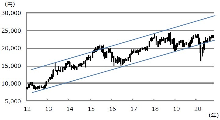 日経平均株価は、2013年5月高値と2018年1月高値を結んだ上値抵抗線と、2012年10月安値と2016年6月安値を結んだ下値支持線によって、上昇トレンドが形成されています(図表1)。いわゆるコロナ・ショックで、春先にいったん下値支持線を割り込みましたが、その後は再びトレンド内に回帰し、現在も下値支持線付近で推移しています。この点から、日経平均株価のトレンド自体は、まだ上向きと解釈できます。
