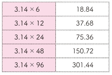2桁(けた)の数についても、2倍ごとに整理して覚えておくとよいでしょう。3.14×6=18.84を2倍ずつ増やしていくと次のようになります。