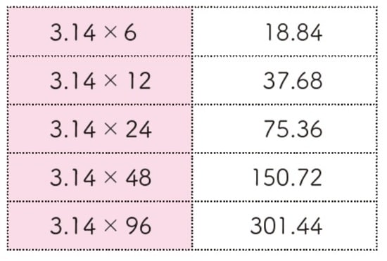 3.14を使った計算は、頻繁(ひんぱん)に出題されます。1桁(けた)の数とのかけ算を九九と同じように覚えておくと、大きな数と3.14をかけ算する時にも便利です。
